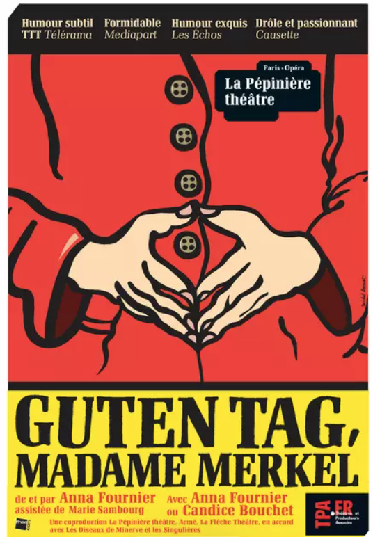 LE PLUS POLITIQUE 🎭 Qu'on la connaisse de près ou de loin, c'est une rencontre fracassante et inoubliable. On est ici dans son intimité, dans son salon ou dans son lit. On revisite l'histoire de l'Allemagne en même temps que sa propre ascension. Ses échanges avec Sarkozy ou Poutine sont jubilatoires. On est aux premières loges des grandes décisions stratégiques politiques du siècle. 🤩 C'est truculent, subtil et très émouvant grâce à Anna Fournier, seule en scène, qui incarne une Angela si drôle et si touchante. |